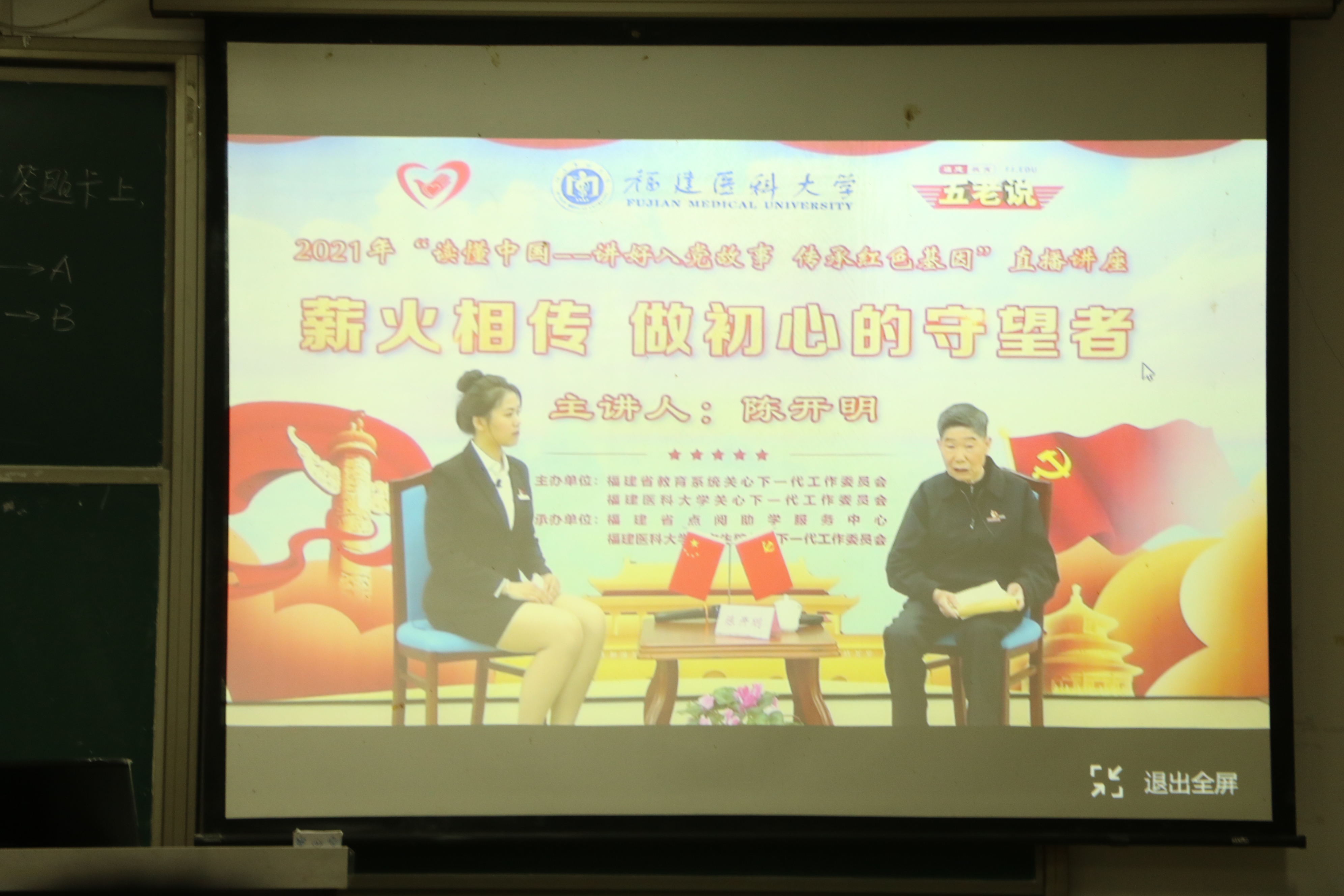 为加强对入党积极分子的党史教育,继承革命党员优良传统,4月24日晚7点半,人文学院组织全体入党积极分子以小组为单位集中观看《福建教育五老说》栏目组第3期“入党初心故事”主题系列讲座直播。本次讲座邀请有着64年党龄的福建省教育系统关工委顾问陈开明同志主讲。